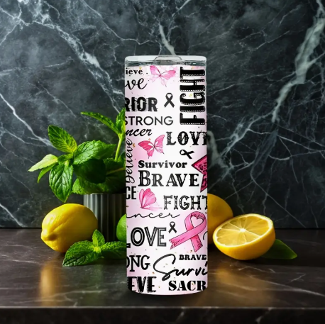 Stay inspired and hydrated with this 20oz Breast Cancer Awareness Tumbler. Featuring powerful words of encouragement and a bold pink ribbon design, this stainless steel insulated tumbler is the perfect companion for on-the-go warriors. Whether you're gifting a survivor or spreading awareness, this motivational drinkware brings comfort, style, and purpose.