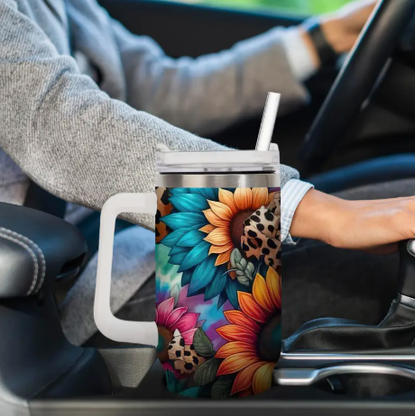 40oz Stainless Steel Tumbler with Handle and Straw, Flower Pattern