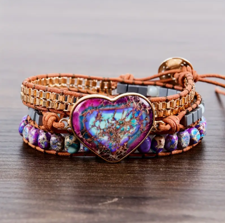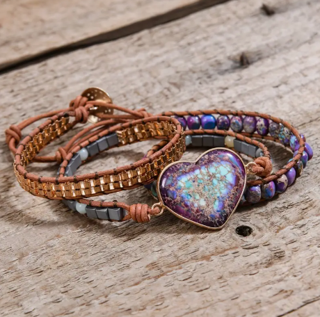 Experience the natural beauty and unique detailing of our Vintage Jasper Stone Braided Leather Bracelet. Each piece is handmade with love and features a charming boho heart design. Perfect for adding a touch of rustic elegance to any outfit. Order yours today and embrace the beauty of nature with this one-of-a-kind accessory!